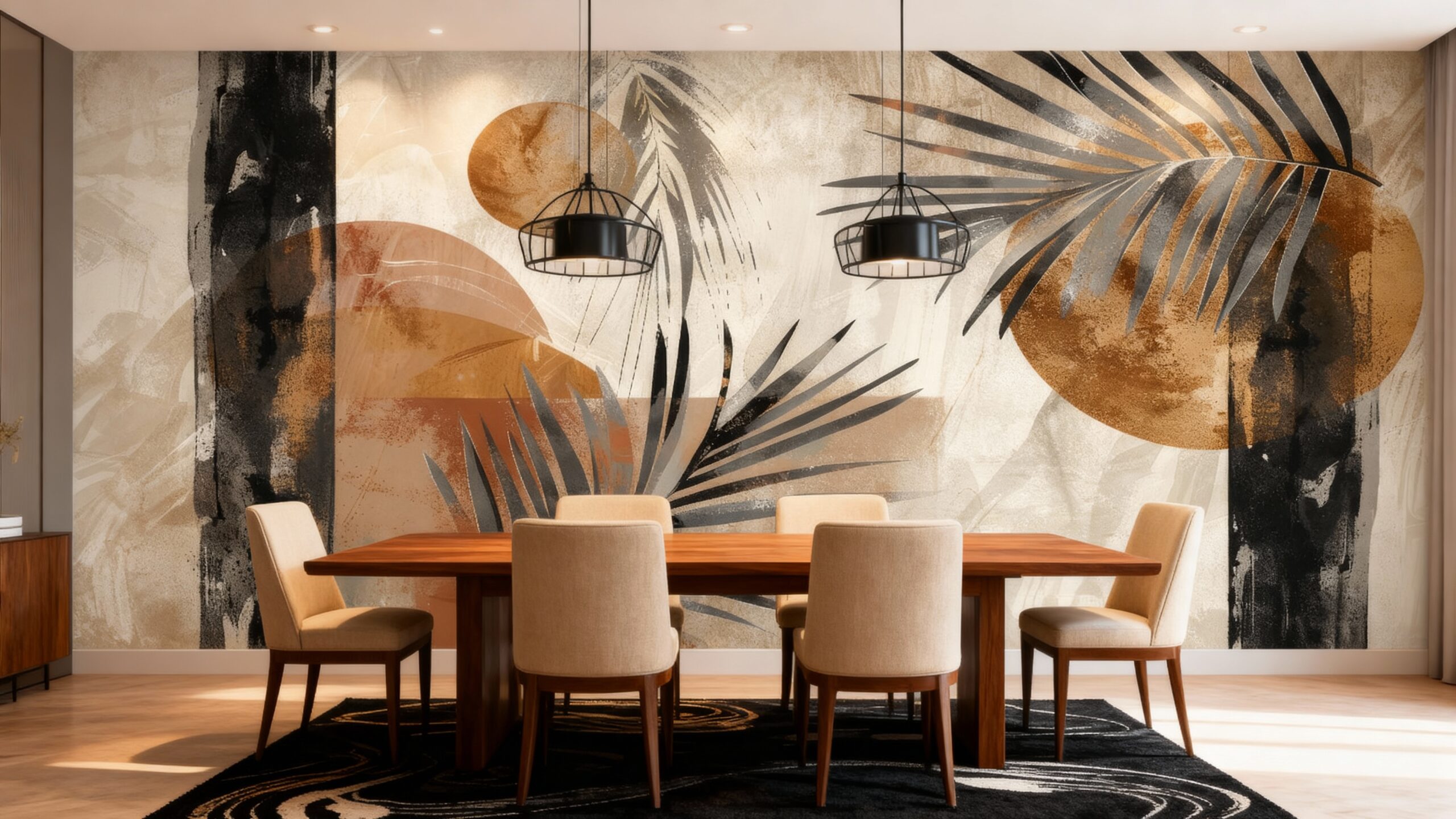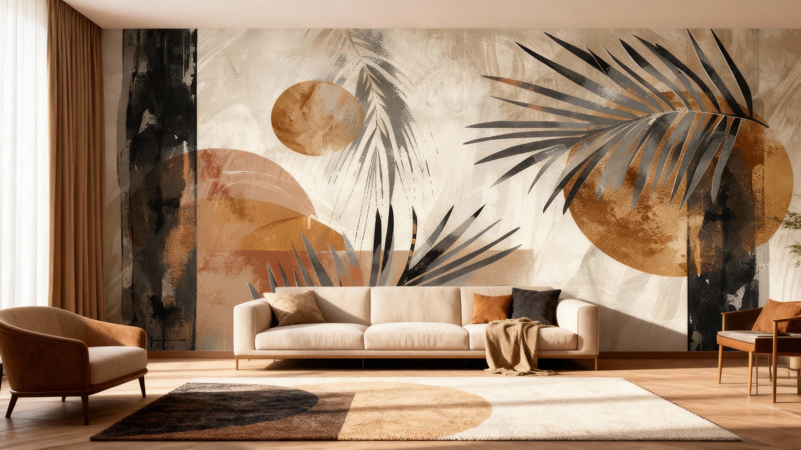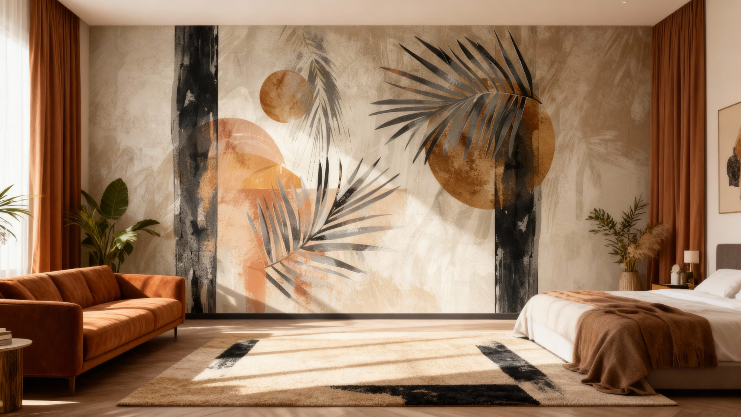 Laat uw interieur tot leven komen met ons exclusieve botanische behang. De warme oranje, zwarte, beige en bruine tinten vormen een artistiek kunstwerk dat iedere ruimte omarmt met een gezellige en verfijnde sfeer.